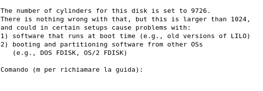 Come potete vedere è possibile che compaia anche un messaggio di warning che ci avvisa che il numero di cilindri del nostro hard disk è maggiore di 1024. Il problema dei 1024 cilindri è molto conosciuto tra gli utenti Linux. I BIOS meno recenti riescono ad accedere solo ai primi 1024 cilindri dell' hard disk e quindi è consigliabile che il boot loader (esempio LILO o GRUB) ed anche l' immagine del kernel siano contenuti completamente nei primi 1024 cilindri.